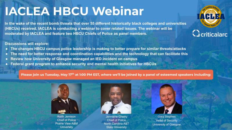 Announcing a HBCU Bomb Threat Virtual Panel Discussion hosted by IACLEA and sponsored by CriticalArc on May 17 at 1pm EST.